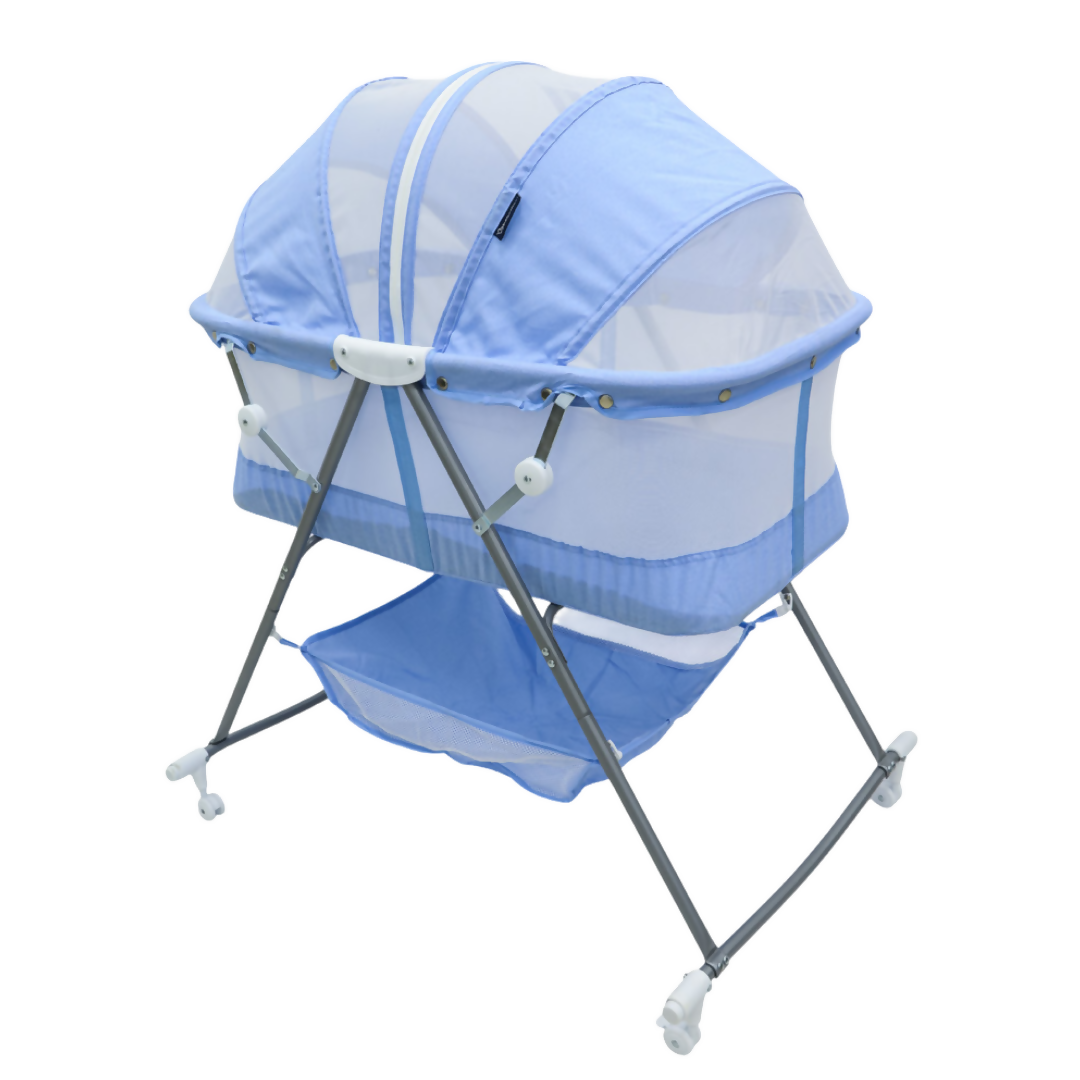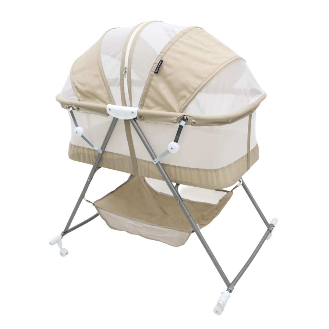 Mosquitero integrado, protegiendo al bebé de insectos mientras descansa, y una canasta inferior para almacenar artículos esenciales como pañales, mantitas o ropa.