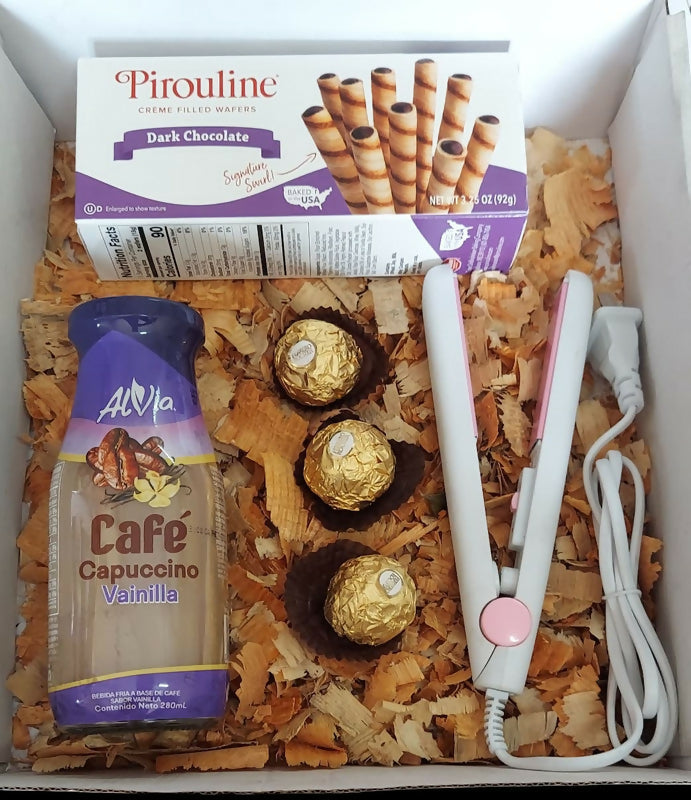 Detalle elaborado con 1 bebida de café, 1 pirouline, 1 mini plancha de cabello, y chocolates ferreror rocher ideal para regalar en cualquier ocasión