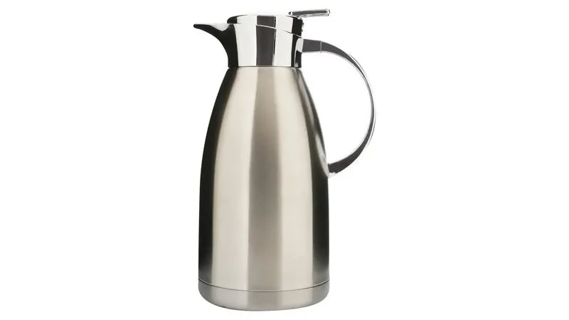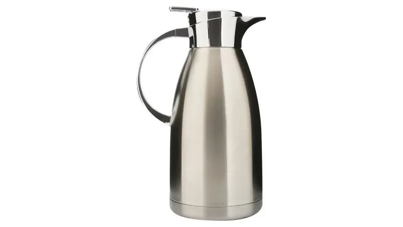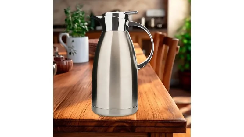 - Su diseño cilíndrico con tapa integrada facilita servir líquidos sin derrames, mientras que el acabado pulido aporta una apariencia simple y funcional. Su tamaño compacto permite utilizarla en cocinas, oficinas o reuniones familiares.