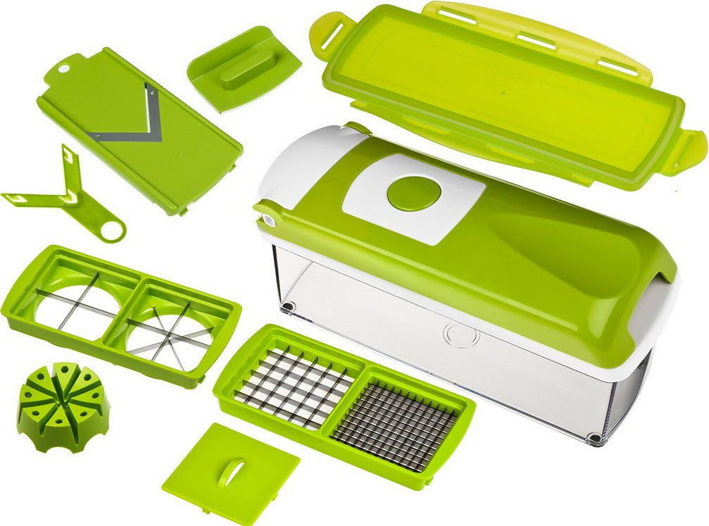 Nicer Dicer Plus es un revolucionario dispositivo multifuncional para frotar y cortar, compuesto por 13 piezas. Incluye todo lo necesario para cortar, moler y rallar. Esta colección es un elemento esencial en la cocina de cualquier ama de casa. Prepárese de forma rápida, sencilla y sin esfuerzo.