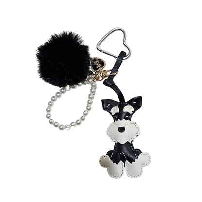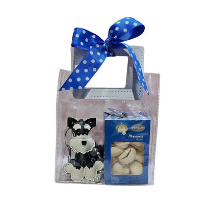 Bolsita reutilizable con asas blancas, cajita de espumillas/merengues y accesorio para llaves o colgar en cartera de perrito Schanuzer blanco y negro con pompon.