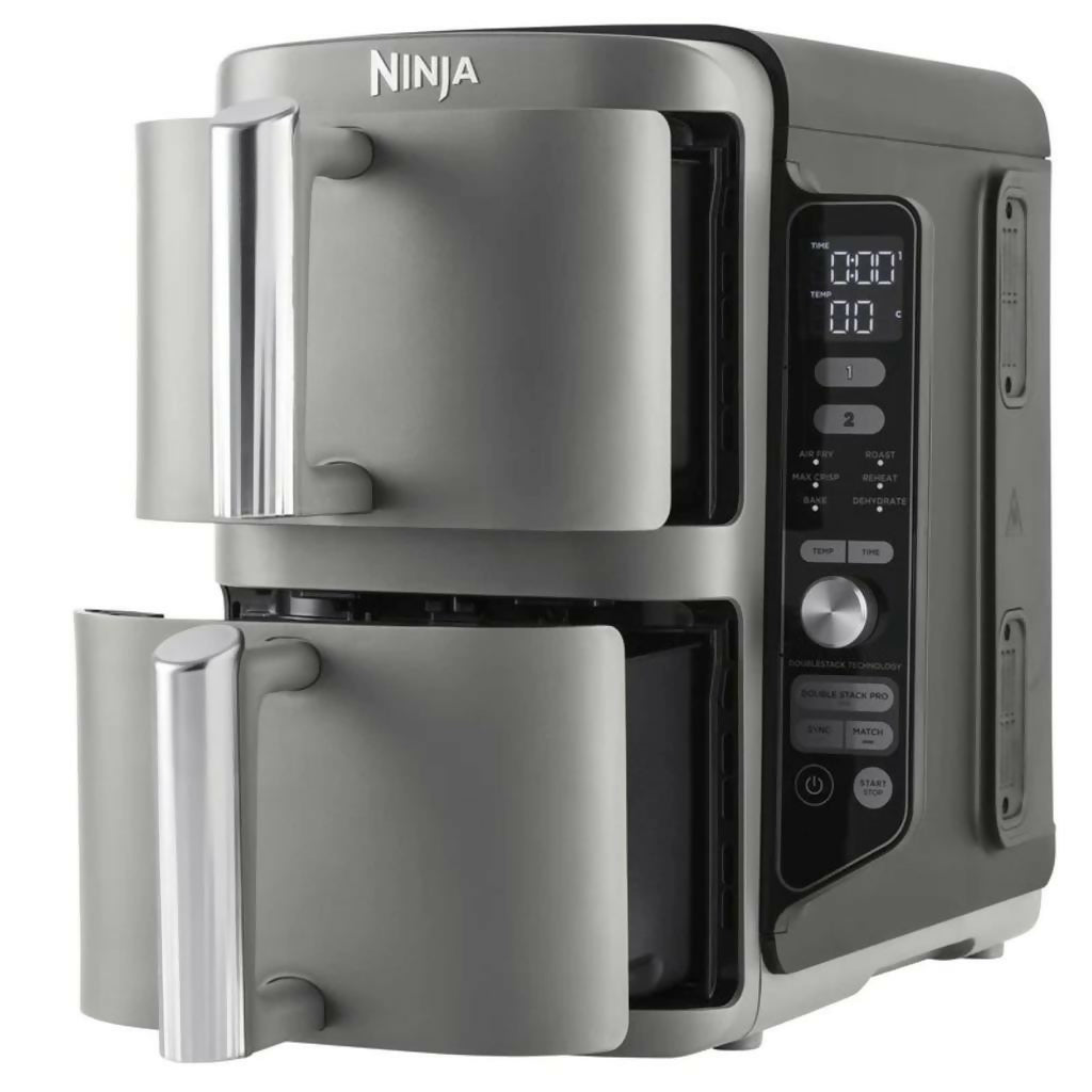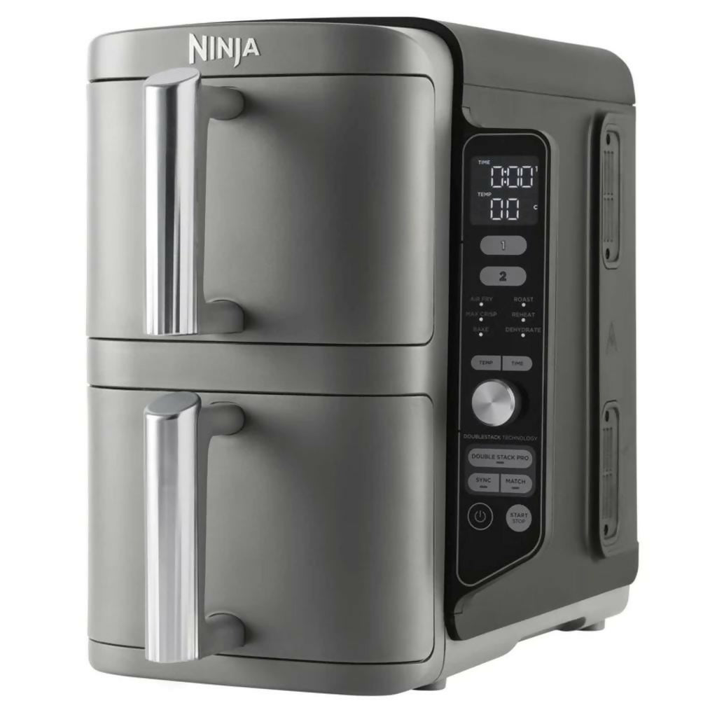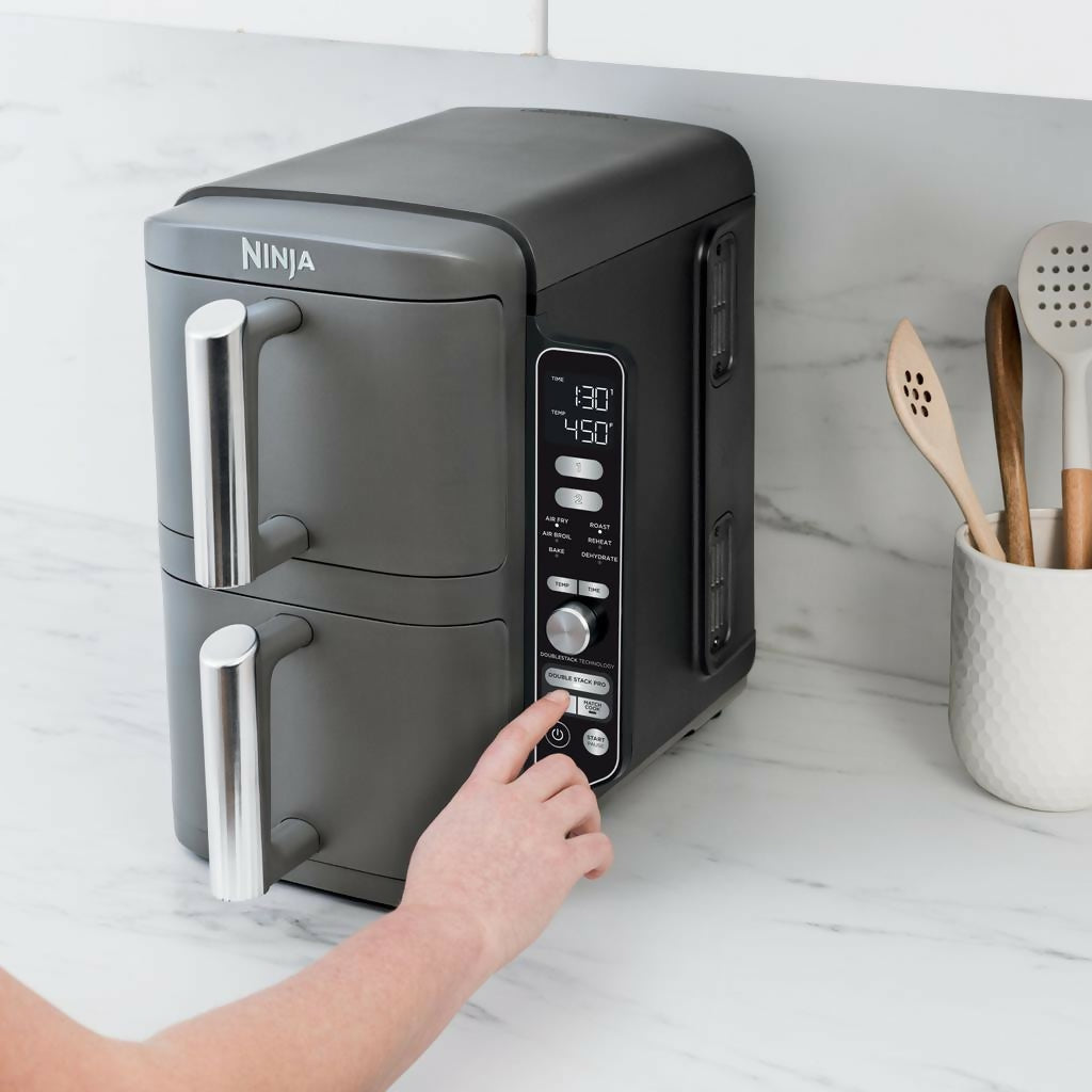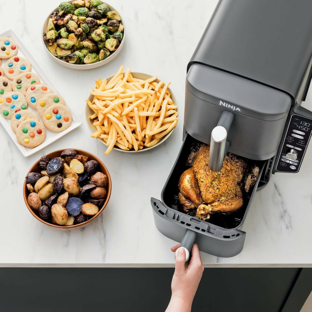 La freidora de aire Ninja DoubleStack XL es ideal para familias y amantes de la cocina saludable, combinando eficiencia, versatilidad y ahorro de espacio en un diseño innovador. Esta freidora puede cocinar hasta cuatro alimentos simultáneamente, permitiendo preparar diferentes platos en menos tiempo y con menos esfuerzo. La tecnología exclusiva de Ninja DoubleStack, asegura un flujo de aire uniforme y un calor constante, logrando resultados perfectamente crujientes, dorados y uniformes en cada preparación. Su diseño inteligente maximiza el espacio en la encimera, ocupando el espacio de una sola freidora de aire convencional, pero con la capacidad de cocinar doble en tamaño y cantidad.