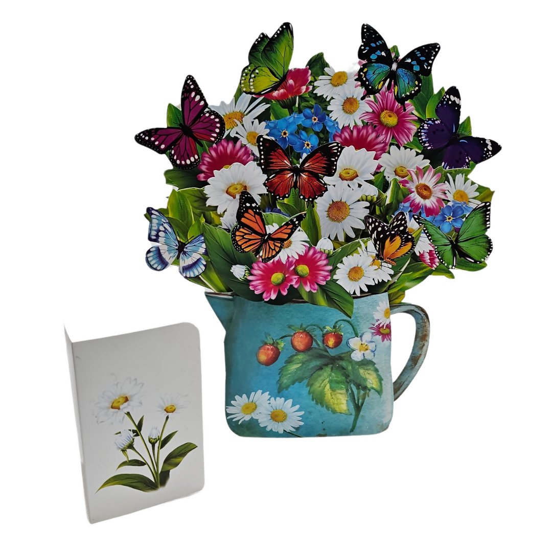 Delicado bouquet de margaritas y lindas mariposas. Adecuado para toda ocasión o simplemte para saludar a un ser querido. Medidas 30cms de alto x 26 cms de ancho. Incluye tarjeta pequeña para dedicatoria.